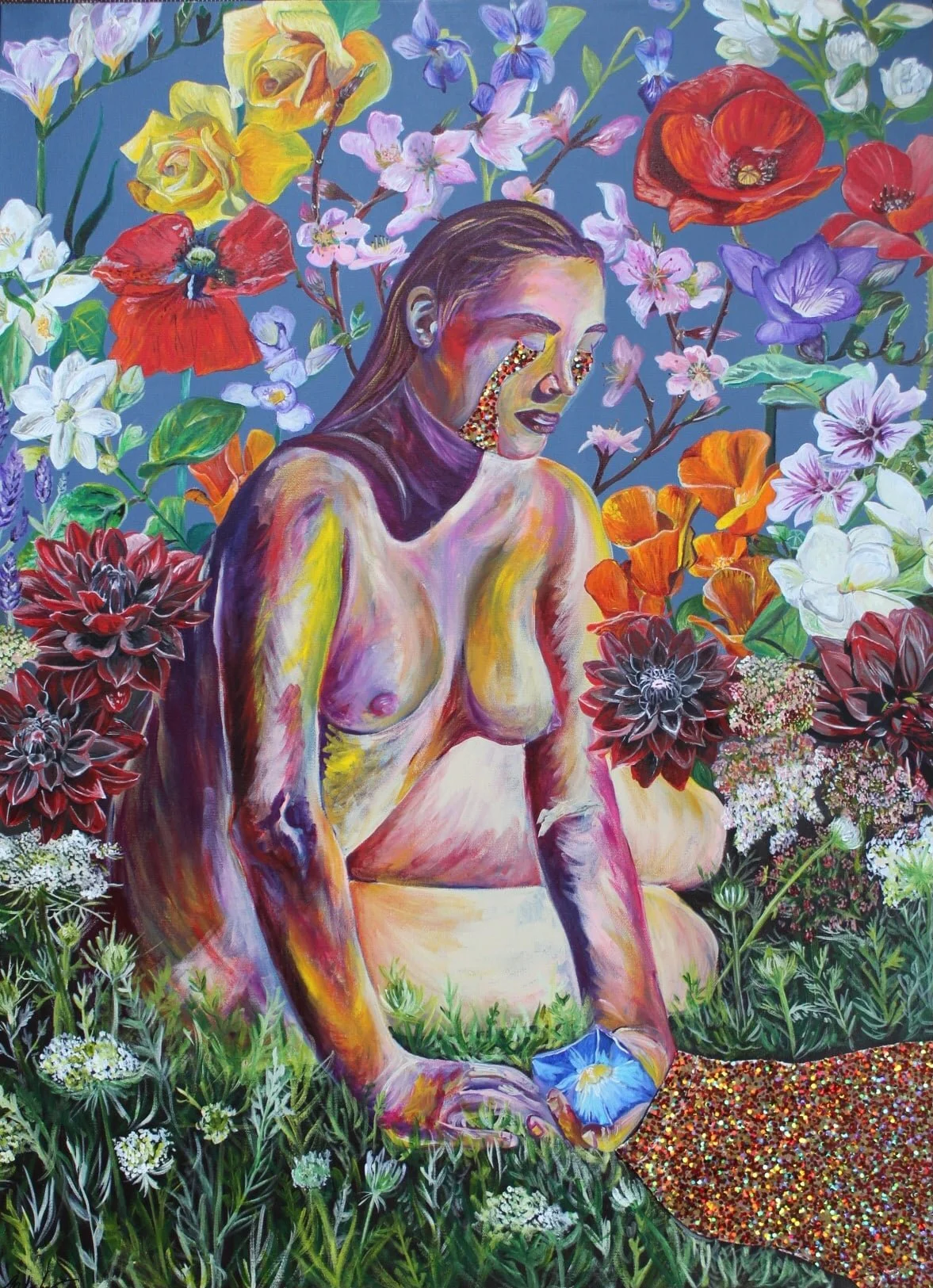 Permanence explores the various and often contradicting portrayals of love and romantic relationships presented by the media, which is embodied by a figure crying and surrounded by flowers. The flowers chosen to be included in this piece symbolize many definitions and expectations of romantic relationships given by the media, from "undying", “dishonesty”, "bridal hope", and "eternal", to, in my opinion, more realistic and healthier ideas such as "nurturing", "sanctuary", and "complexity". Though there are a spectrum of flowers present in this piece, the figure ultimately holds a Moonflower, which represents them still dreaming of love, one that is free from the harmful and rigid behaviors and expectations of the media and past relationships.